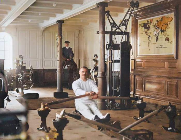 Для пассажиров первого класса на борту предоставлялись услуги тренажерного зала и гимнастического. Элита могла потренироваться на тренажерах, поплавать в бассейне или поупражняться на гребном тренажёре, что мы и видим на фотографии.