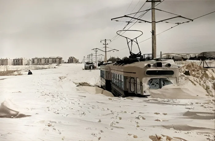 Застрявшие в снегу трамваи. Комсомольск-на-Амуре, 1960-е.