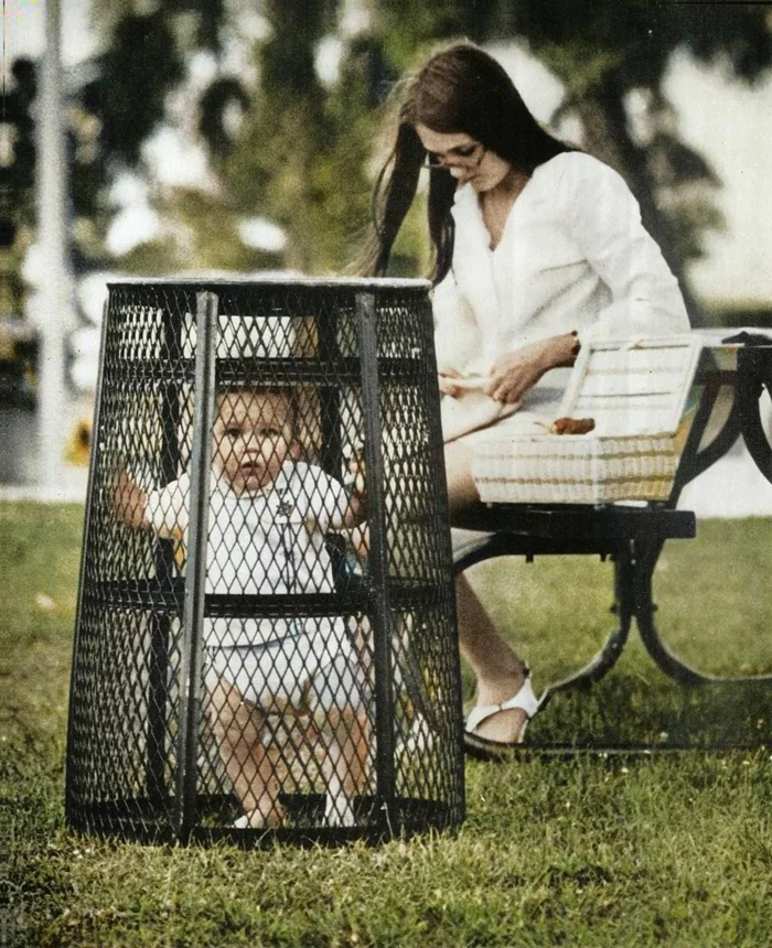 Мама использовала мусорное ведро, чтобы сдержать своего ребенка, пока она вяжет крючком в парке. США, 1969 год.