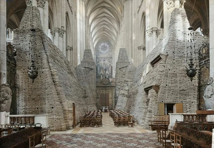 Мешки с песком использовались для защиты от бомб во время Первой мировой войны, Амьенский собор.