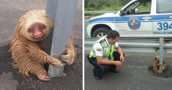 2. Полицейский спас ленивца, оказавшегося на дороге