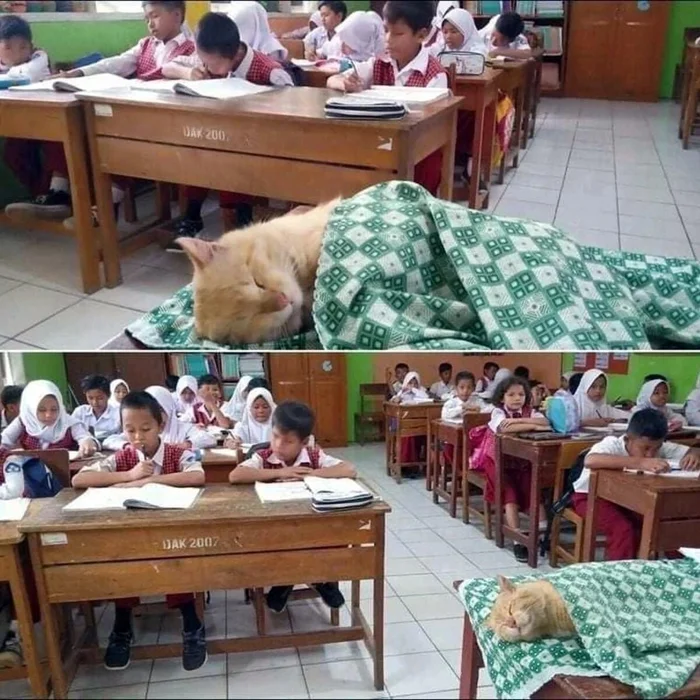 В школе Индонезии для поддержания тишины на уроках укладывают кота спать