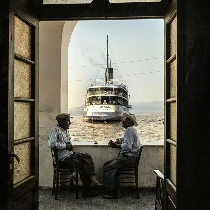 Душевный разговор за чашечкой кофе в порту острова Санторини. Греция, 1954 год.