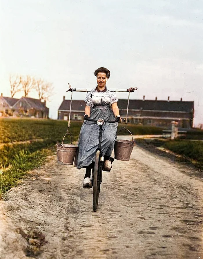 Крестьянка едет на велосипеде с ведрами молока на коромысле. Нидерланды, 1946 год.