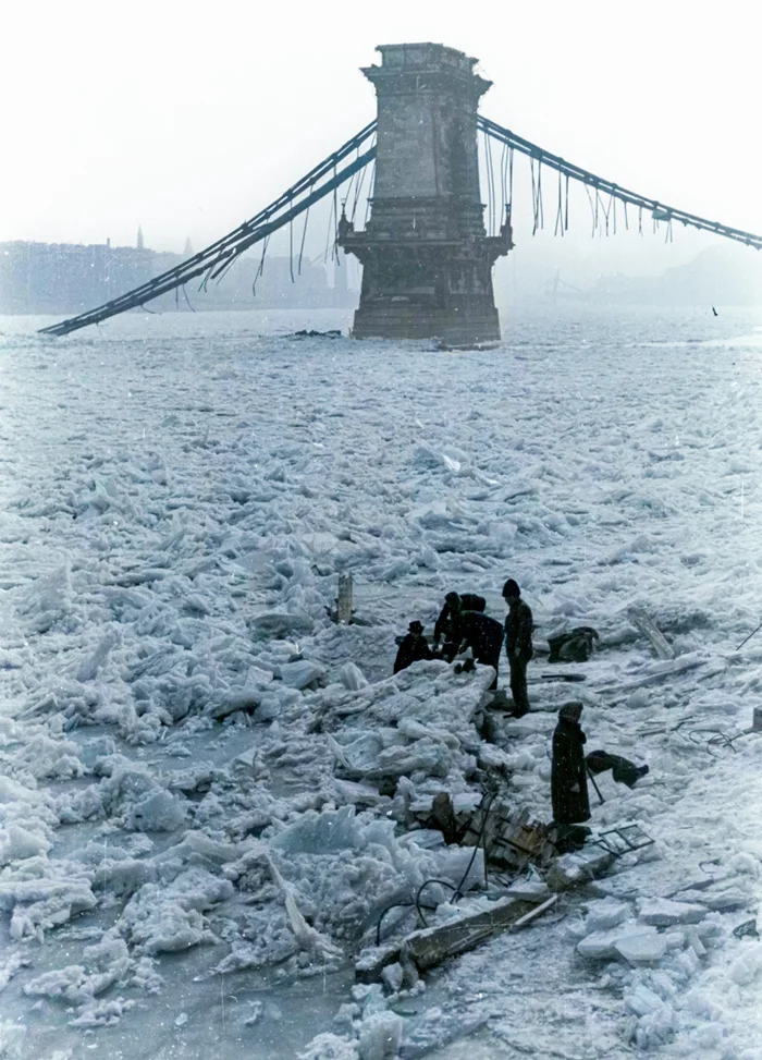 Взорванный Цепной мост Будапешта и замерзший Дунай, 15 января 1945 года.