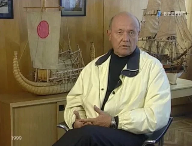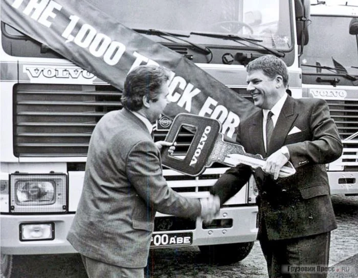 Президент Volvo International Ове Андерсcон передаёт 1000-й тягач техническому директору «Совтрансавто» Виктору Васильевичу Самохвалову, 1989 год
