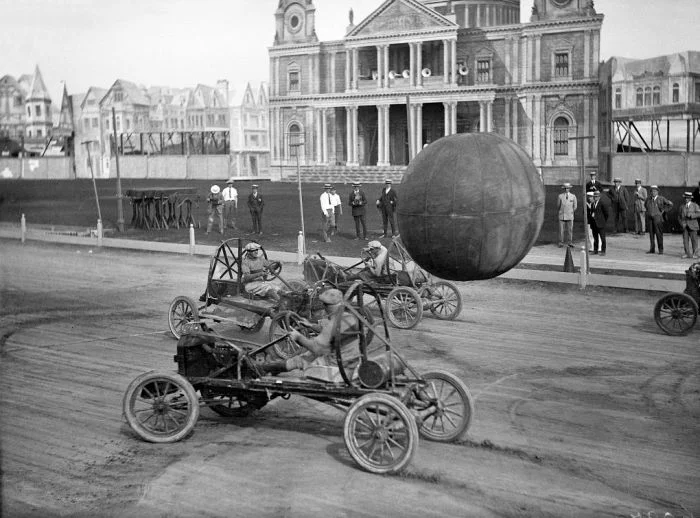 12. Мужчины за рулем специальных автомобилей играют с огромным мячом в пушбол, Канада, 1925 год