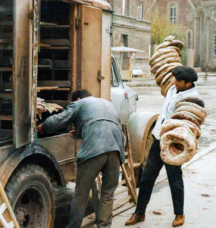Работники булочной выгружают свежие лаваши из хлебного фургона. Армения, Гюмри 1967 год.