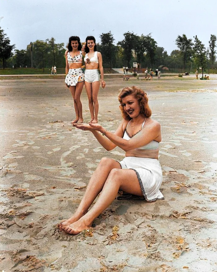 Девушки из бродвейского шоу соревнуются в конкурсе по поеданию спагетти без рук. США, 1948 год.