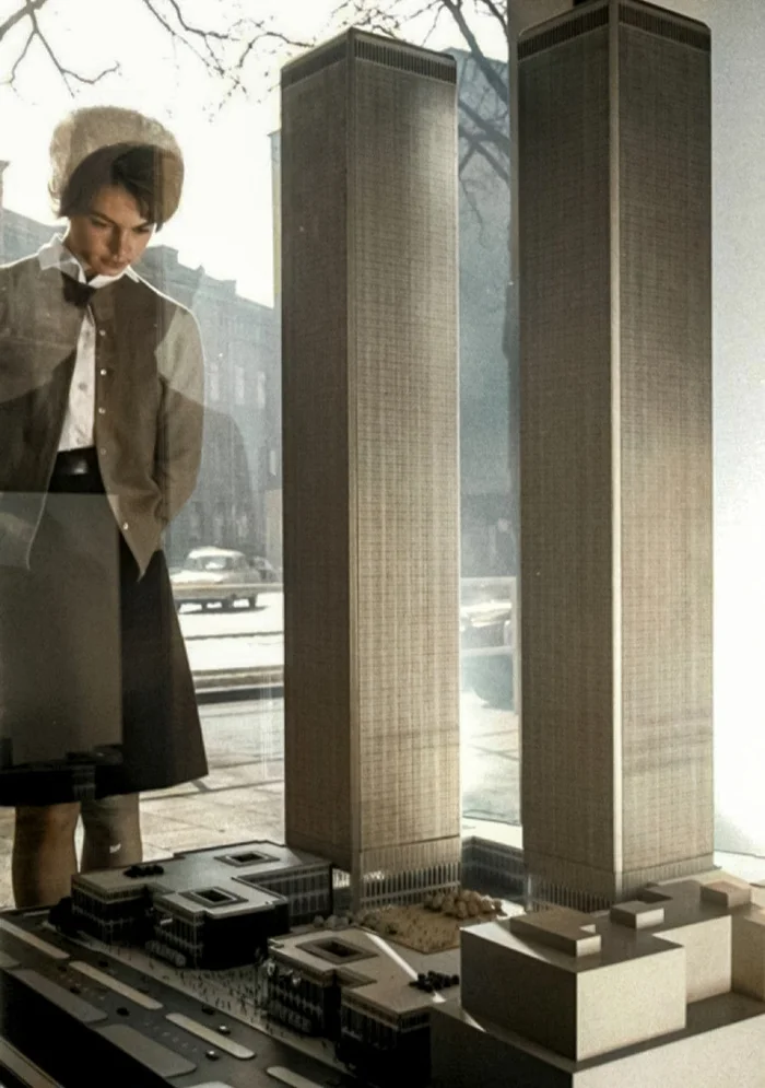Женщина рассматривает модель запланированного Всемирного торгового центра, конец 1960-х.