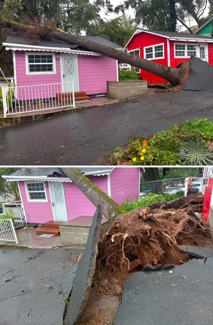 "Мой 84-летний сосед и его жена спали в постели, когда во время урагана от дерева отломилась ветвь длиной более 6 м и попала в их дом. Это произошло около часа ночи. Они позвали меня на помощь, и мой сосед со смехом объяснил, что дерево упало между его ног, когда он спал на спине. Он залез на кровать и показал мне. Ветвь находилась в 3 см от его паха".