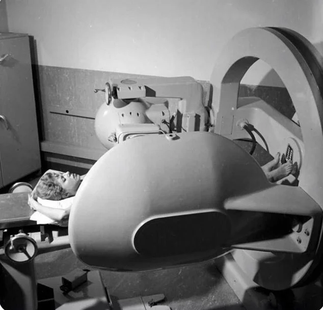 2. Пациент в аппарате «Железные легкие» — аппарате искусственного дыхания, примерно 1938 г.