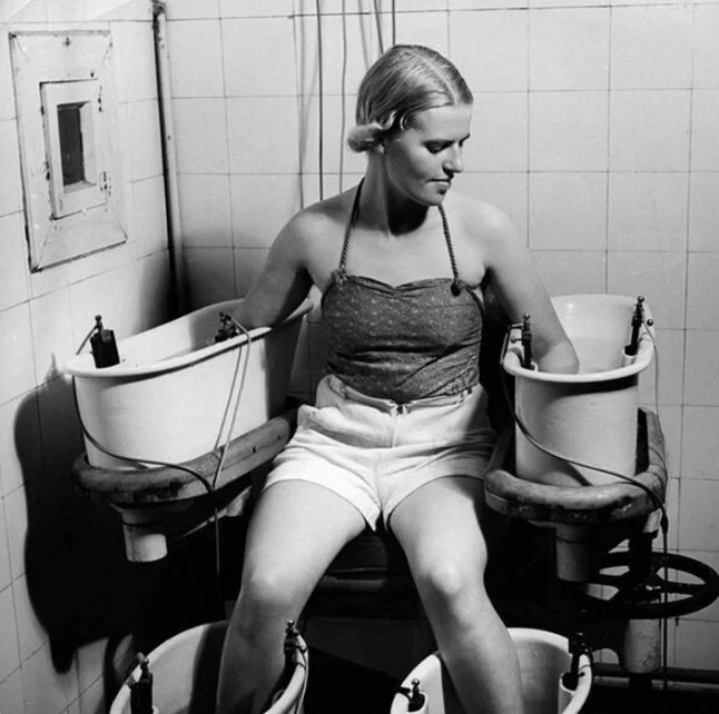 15. Молодая женщина держит руки и ноги в водяных ваннах (по одной на конечность) с электрическим током для улучшения кровообращения, 1938 год