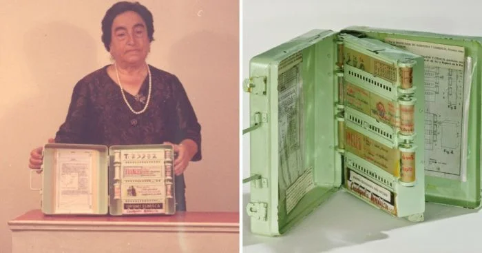 А так выглядел предвестник первых электронных книг. Запатентована эта чудо-книга была в 1949 году. Испанская писательница Анхела Руис Роблес наделила своё изобретение механизмом, позволяющим увеличивать фрагменты текста и перелистывать страницы сжатым воздухом без помощи рук.