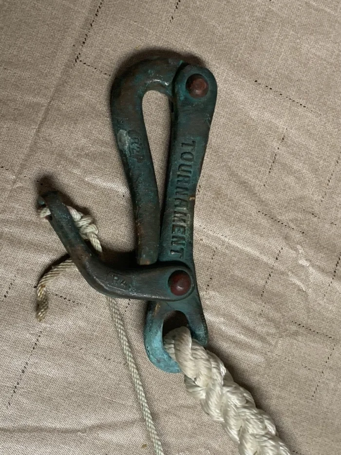 Это карабин или крюк типа "пеликан" - удобное приспособление для быстрого пристегивания и отстегивания грузов.