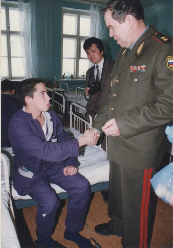 Лев Рохлин посещает раненых солдат в госпитале Волгограда, 1990-е годы.