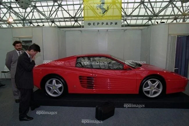 Посетители смотрят автомобиль «Ферра́ри» в автосалоне Москвы, 1993 год.