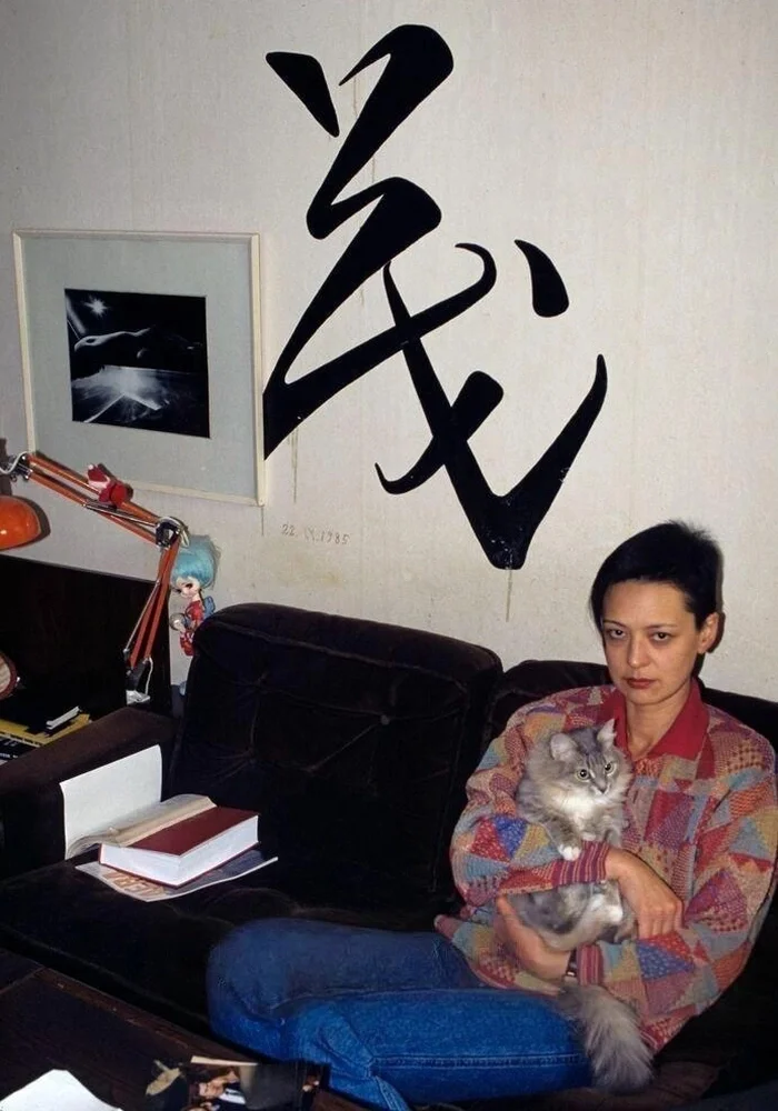 Ирина Хакамада дома с кошкой Гризой. На стене фамильный иероглиф семьи Хакамада.