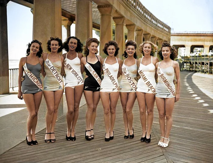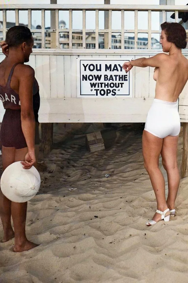Женщина указывает спасателю на знак, на котором говорится, что можно загорать без верхней одежды, хотя знак этот был предназначен только для мужчин. Нью-Джерси, 1939 год.