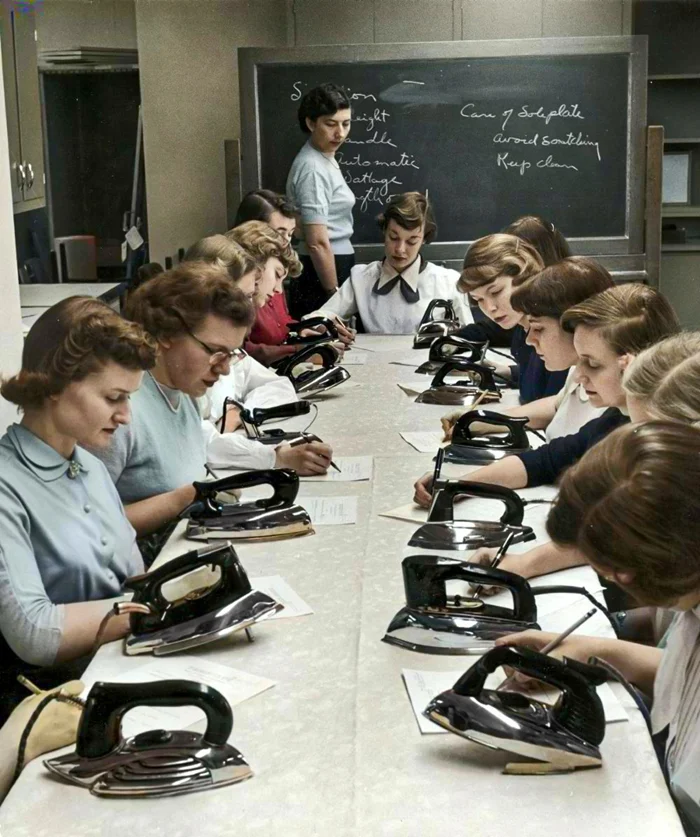 Студентки Корнельского университета знакомятся с тонкостями глажки на уроке домоводства, 1951 год.