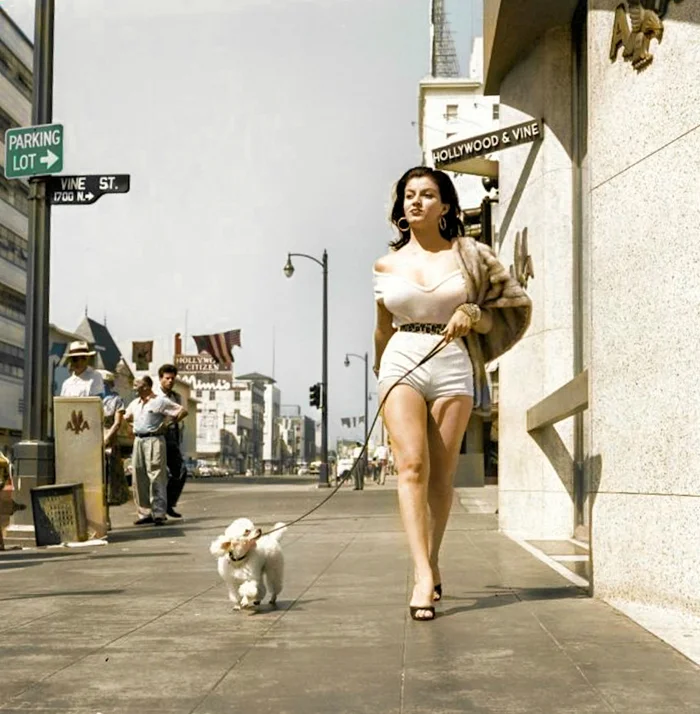 Американская актриса Джоан Брэдшоу со своим питомцем идёт по улице "Голливудский бульвар", Лос-Анджелес, штат Калифорния, США, 1957 год.