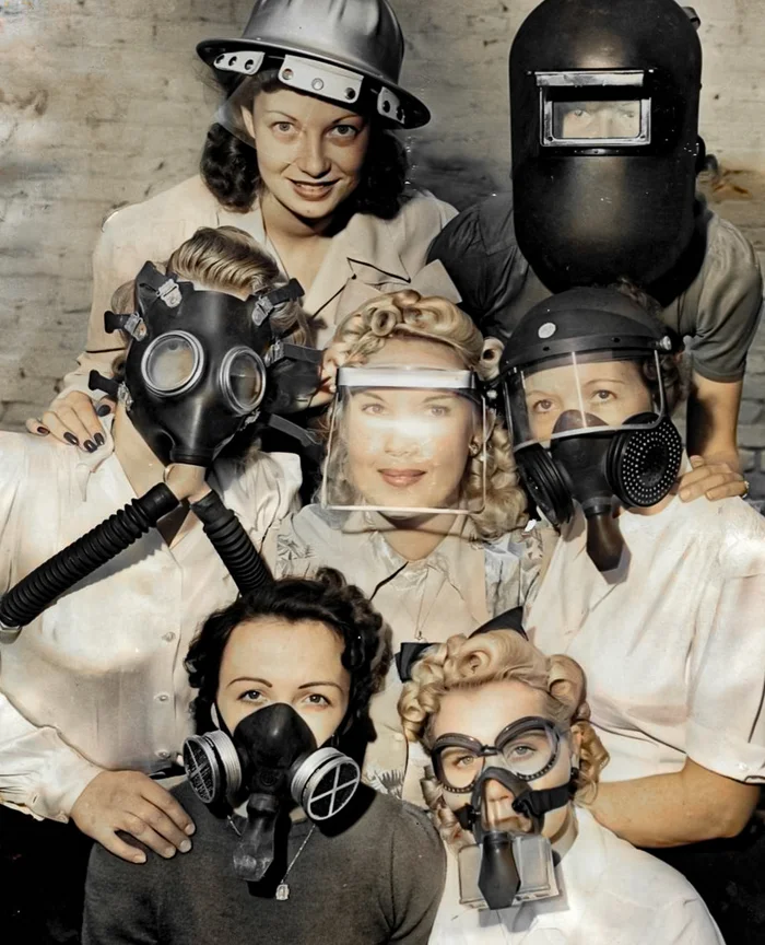 Группа девушек демонстрирует разные типы защитных масок в рамках популяризации мер технической безопасности на производстве, 1940 год.