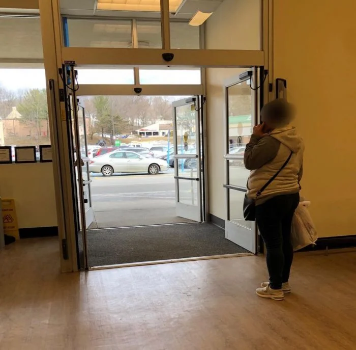 6. На улице очень холодно, а эта женщина стоит у автоматических дверей, не думая об окружающих