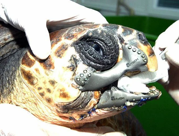 3. Черепаха попала в аварию с лодкой, и потеряла большую часть своего клюва. Ученые сделали для неё новый титановый клюв с 3D-печатью