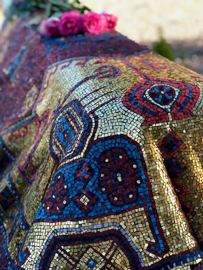 Издалека кажется, что его могила накрыта настоящим цветным восточным ковром, но, если подойти поближе, быстро понимаешь, что ковер на надгробии не настоящий. Это мастерски уложенная цветная мозаика в виде ковра. Такое надгробие - дань уважения одной страсти Нуреева - при жизни он коллекционировал антикварные тканые изделия.