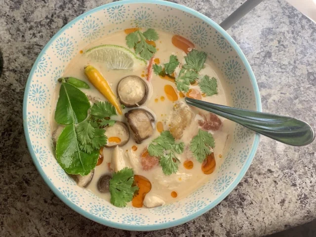 Острый куриный суп с добавлением грибов, сваренный на кокосовом молоке.