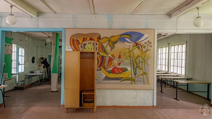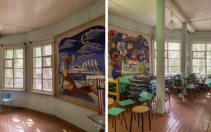 Внутри — всё в лучших советских традициях. Ворота лагеря оказались той самой машиной времени, что пусть и ненадолго, вернула нас в атмосферу советского прошлого. Интерьеры потускневшие и наивные, словно детские воспоминания: наборные окна, колченогие табуретки, белые шары-люстры и многое другое, напоминает о былом.