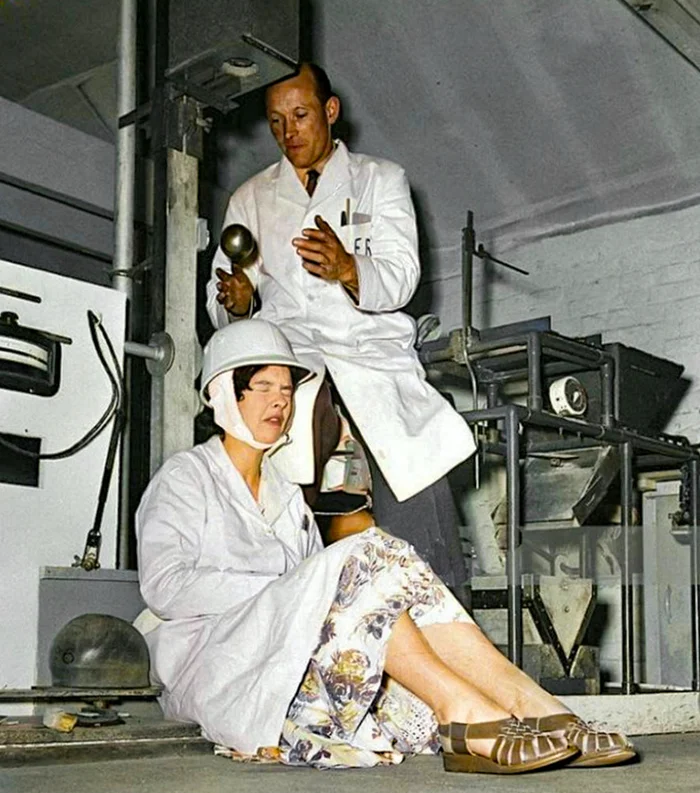 Работник исследовательского центра «Eliis Research laboratory» тестирует мотоциклетный шлем бросая на него стальной шар, 1957 год.