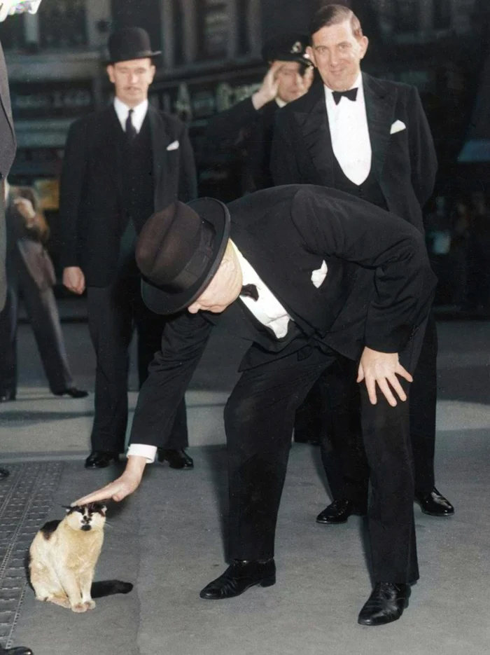 Уинстон Черчилль гладит кошку на Ливерпуль-стрит, Лондон, 24 мая 1952 года.