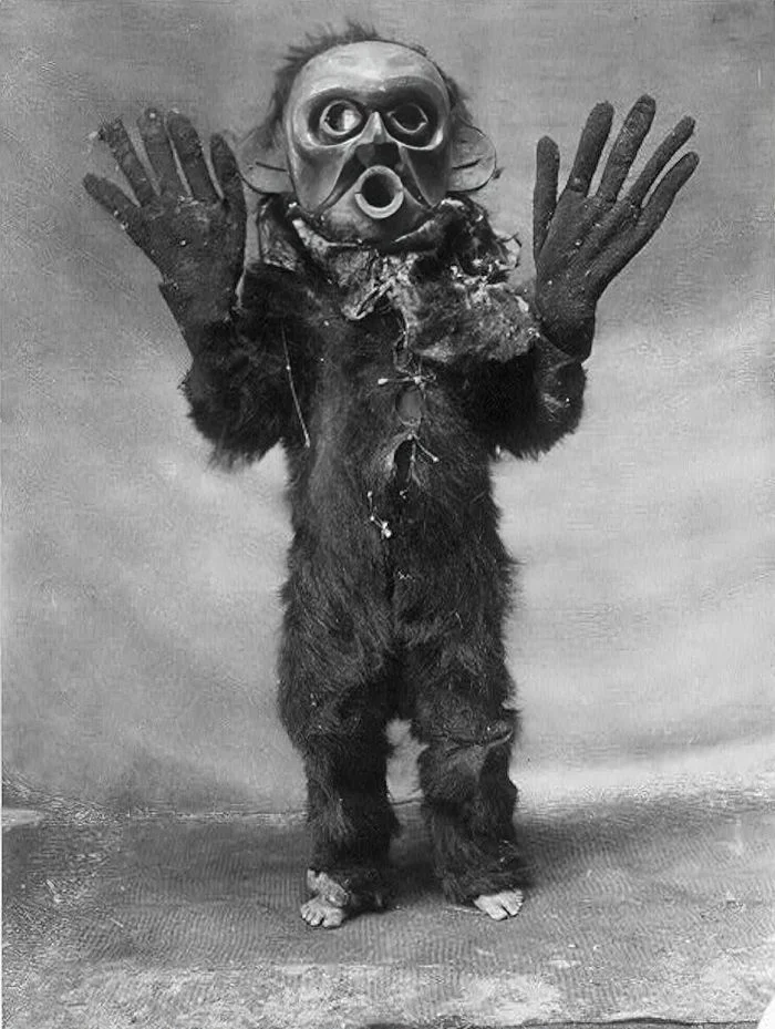 3. Индеец из племени коскимо в меховом костюме, больших перчатках и маске хами во время традиционной церемонии. США, 1910 год
