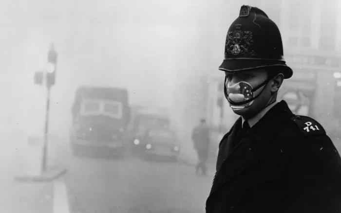 14. Полицейский в защитной маске во время смога в Лондоне, 1952 год