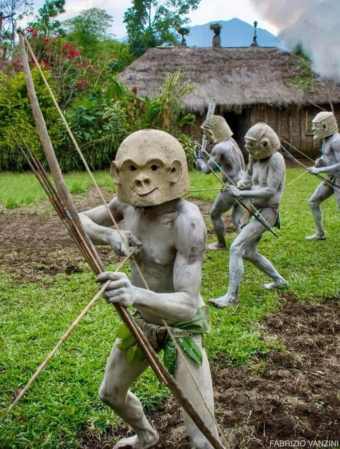 24. Мужчины из племени асаро мадмен (Asaro Mudmen, «Грязевые люди Асаро») в церемониальных глиняных масках, Папуа-Новая Гвинея