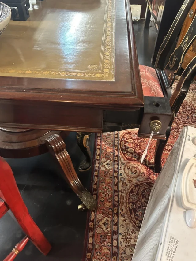 Это не обеденный стол. Это игровой стол, скорее всего, из XIX века. Ящик называется «свечной горкой». Собственно, туда ставится свеча.