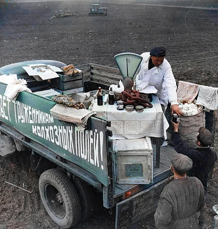 Автолавка в поле. СССР, 1960-е годы.