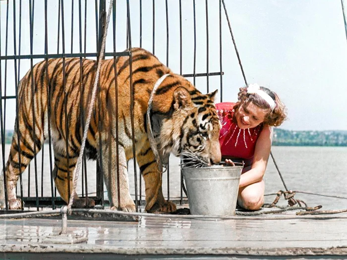 Укротительница Маргарита Назарова и тигр Пурш на палубе теплохода во время съёмок фильма «Полосатый рейс», 1956 год.