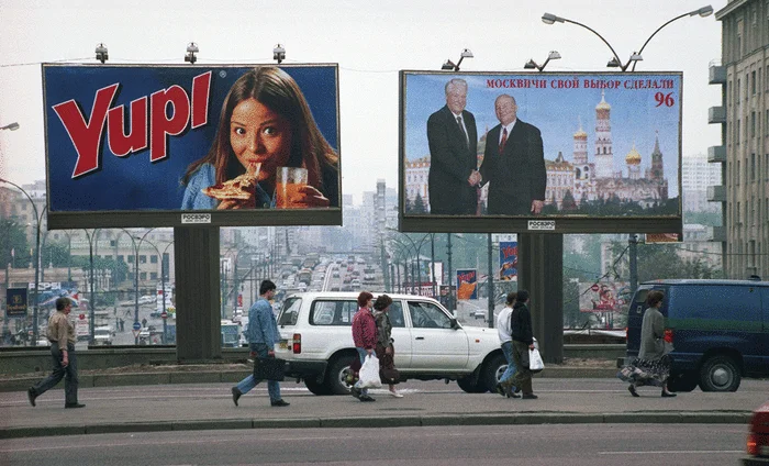 Предвыборный плакат и рекламный баннер растворимых напитков «Yupi» в центре Москвы. 17 мая 1996 года