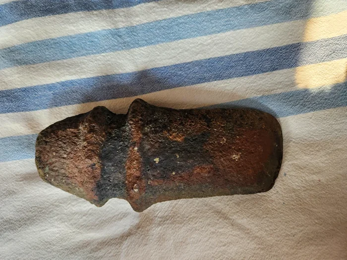 Лезвие каменного топора. То ли реально нашел старое, то ли кто-то придуривался и сделал.
