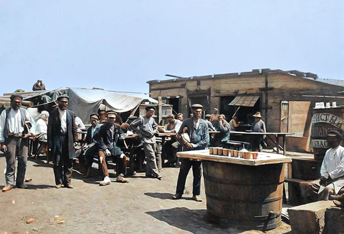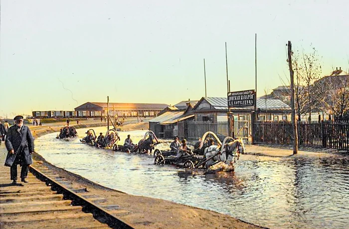 Снимок сделан во время паводка. На вывеске: Пивоваренный завод "Донская Бавария" Д. Е. Котелевца основан в 1878 году. Скорее всего тот квас у рабочих был сварен именно тут.