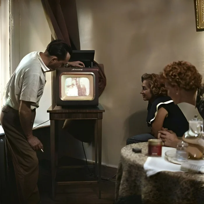 Мужчина настраивает телевизор "Авангард", 1956 год.