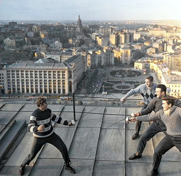 Советский фехтовальщик Григорий Крисс (слева) с друзьями на крыше семнадцатиэтажного здания гостиницы "Украина". Киев, 1964 год.