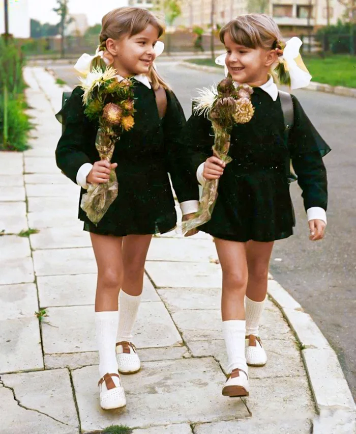 Сёстры-двойняшки идут в школу. Литва, 1974 год.