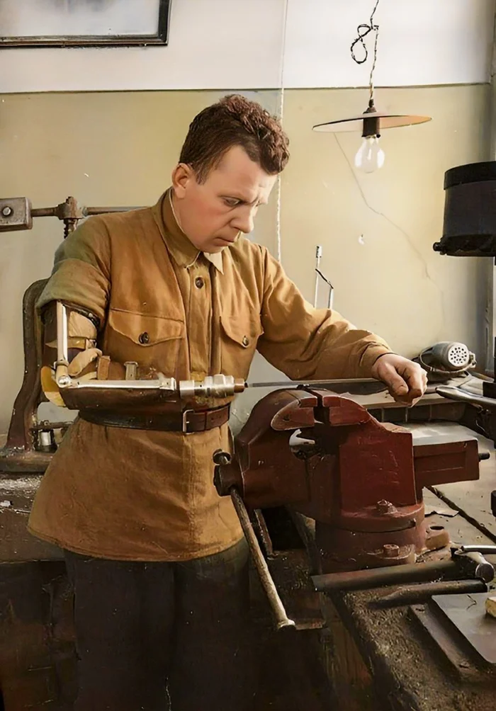 Инвалид Великой Отечественной войны Резников, слесарь 4 разряда, за работой в мастерской системы кооперации инвалидов, 1942 год.