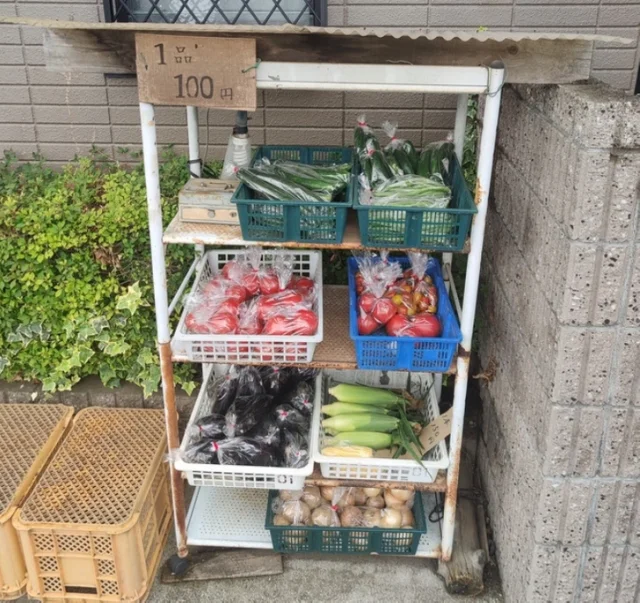 Фермерская полка. Можно просто опустить монетку и взять что хочешь. Все полностью на доверии. Один дедушка убирал не проданные за день помидоры и отдал нам их просто так