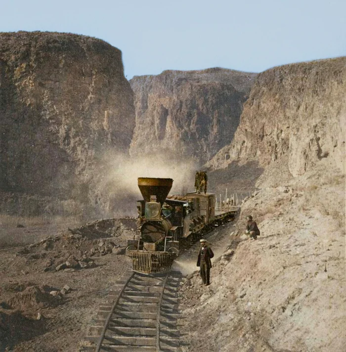 Первый строительный поезд проезжает Палисейдс, Десятимильный каньон, 1866–1869 год.
