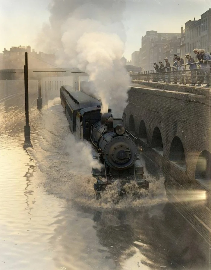 Паровоз движется по затопленной улице во время наводнения в Бостоне, 1915 год.