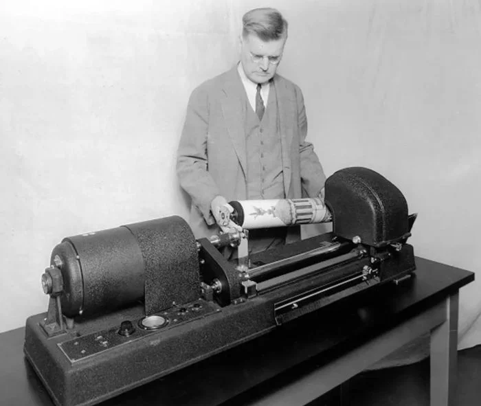 Факсимильный аппарат был запатентован в 1843 году Александром Бэйном как «электрический печатающий телеграф». Первый коммерческий телефакс представил итальянский физик Джованни Каселли в 1865 году.